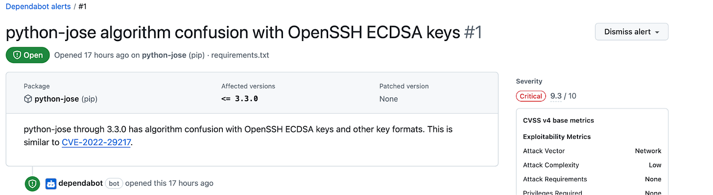 GitHub's dependabot security features do not claim to catch all vulnerabilities . it’s features are not substitutes for human review of each dependency for potential vulnerabilities