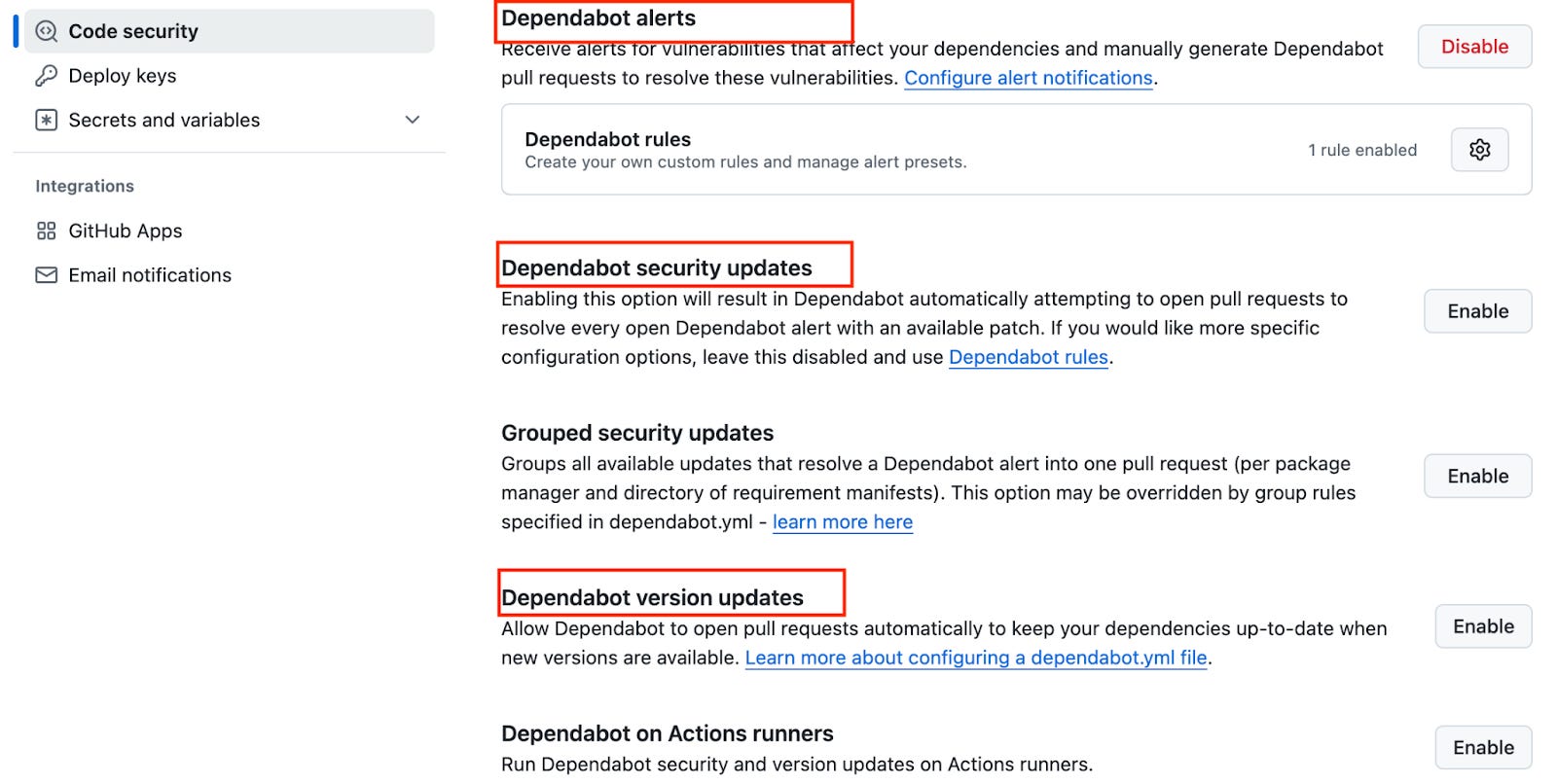 These above 3 features can be enabled in each repository’s ‘settings’ -> ‘Code security’ section in Github as seen below